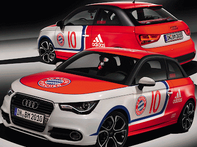This compact car has the Number 10 of FC Bayern star Arjen Robben on the roof and on the doors. The adhesive design with through-colored film and digitally printed film makes a very high-quality impression, as this technique shows off reflections to their best advantage. With the large logo of Germany's most successful soccer club on the hood, the restyled front bumper and a modified diffuser in the back, this A1 immediately stands out from the crowd. Another highlight is the sill sporting visual cues from the S line.